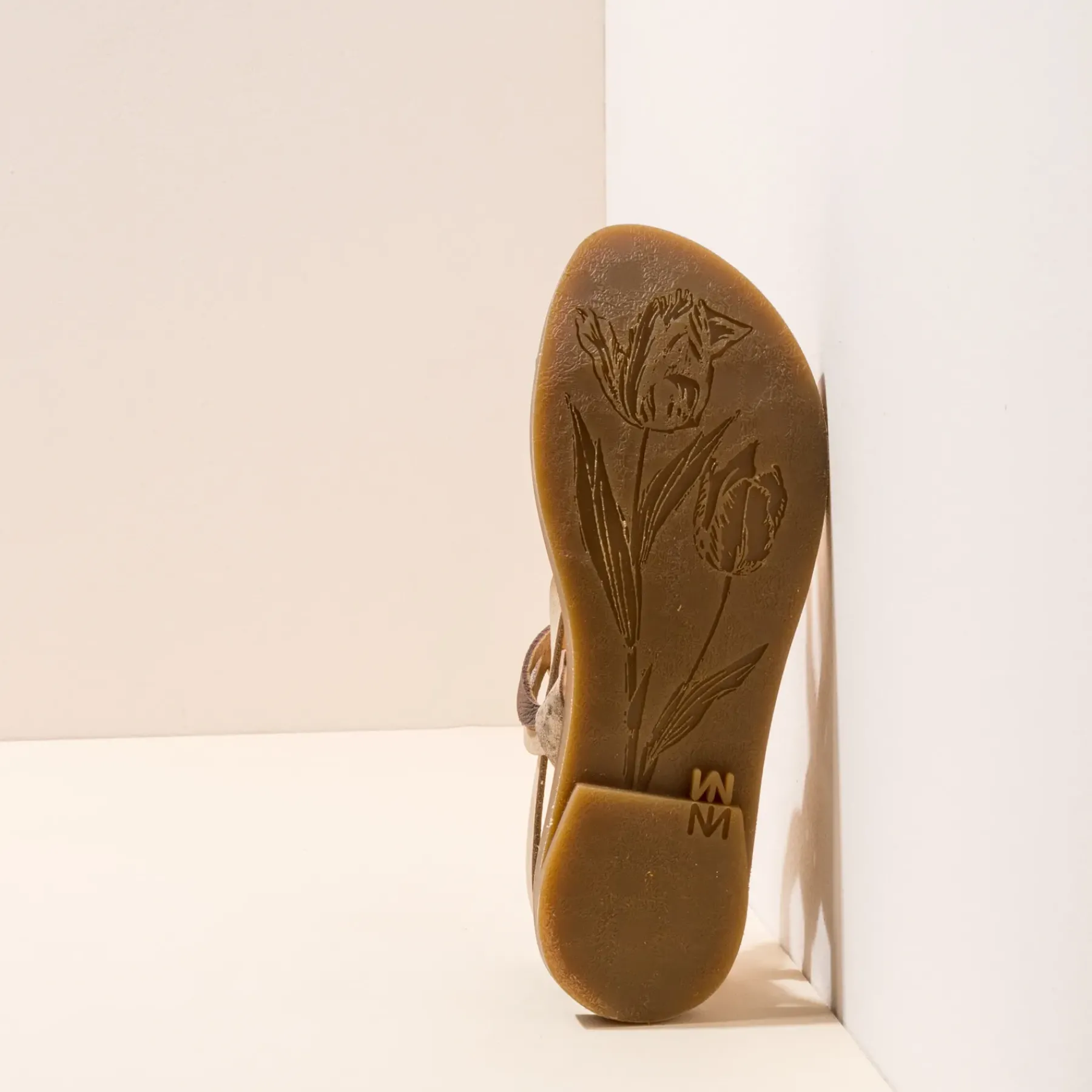 Evergreen, Joyeux Et Elegant. Ce Sont Les Tulipes Qui Sont Dessinees Sur La Semelle En Caoutchouc. Cette Sandale Se Distingue Par Sa Grande Souplesse Et Son Confort. Il Sagit Dune Sandale Decontractee Et Durable, Car Nous Utilisons Du Caoutchouc Et Du Cuir Recycles Pour Fabriquer La Semelle Et La Semelle Interieure.